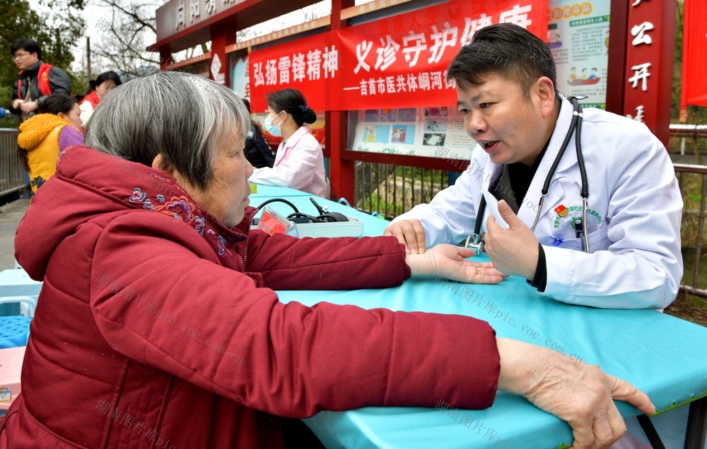 图为,3月5日上午,吉首市医共体峒河街道分院工作人员在向阳社区为群众开展免费义诊。 石雪源 杨艳萍 摄