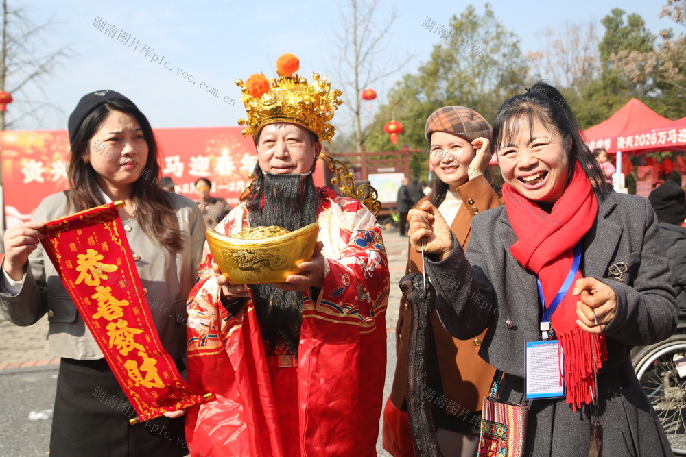 2月3日,资兴市市民选购腊肉后,手拿腊肉与捧金宝盆者身边而行,心里高兴,沾沾喜庆年味。欧祖生 摄