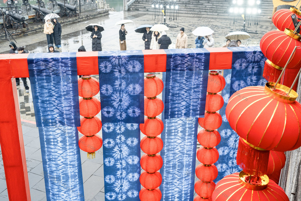 2月9日,吉首市乾州街道乾州古城,人们在新安好的红灯笼前游览、跳舞,洋溢浓浓年味和年节喜气。梁永鸿 摄