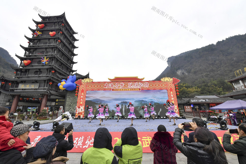 2月17日,游客们在湖南省张家界市武陵源区标志门广场观赏新春文化活动展演。 邵颖 摄