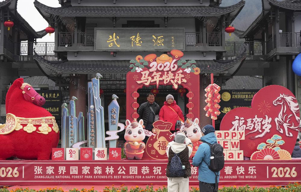 2月17日,游客们在湖南省张家界市武陵源区标志门广场与春节装扮景观墙合影留念。 邵颖 摄