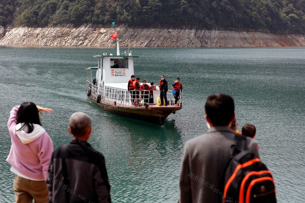 2020年3月8日,资兴市滁口镇高湾村高湾码头,受新冠肺炎疫情影响,所有人出门都戴着口罩。库区内4个乡镇内靠摆渡船连接,离开库区也需乘客船。