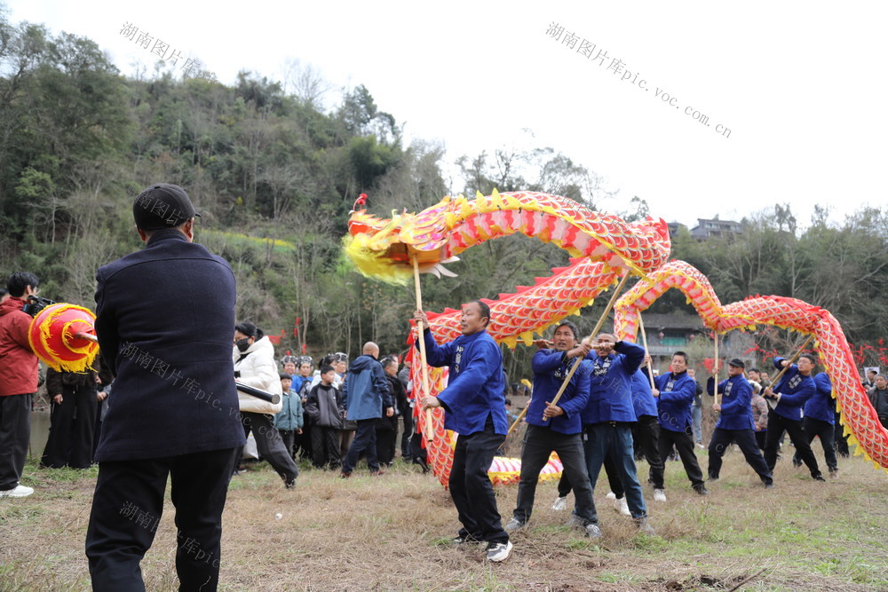 3月3日,湖南省湘西土家族苗族自治州吉首市丹青镇河坪村举办“苗族调年节”活动,村民在活动现场参加舞龙表演,共同祈愿新年风调雨顺。张术杰 摄