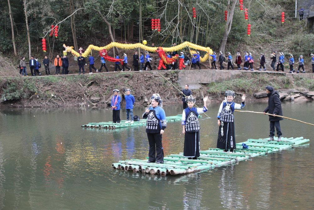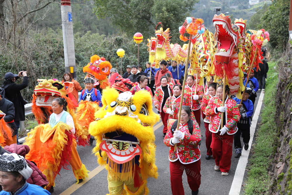 3月3日,湖南省湘西土家族苗族自治州吉首市丹青镇河坪村举办“苗族调年节”活动,村民在活动现场参加舞龙舞狮表演,共同祈愿新年风调雨顺。张术杰 摄