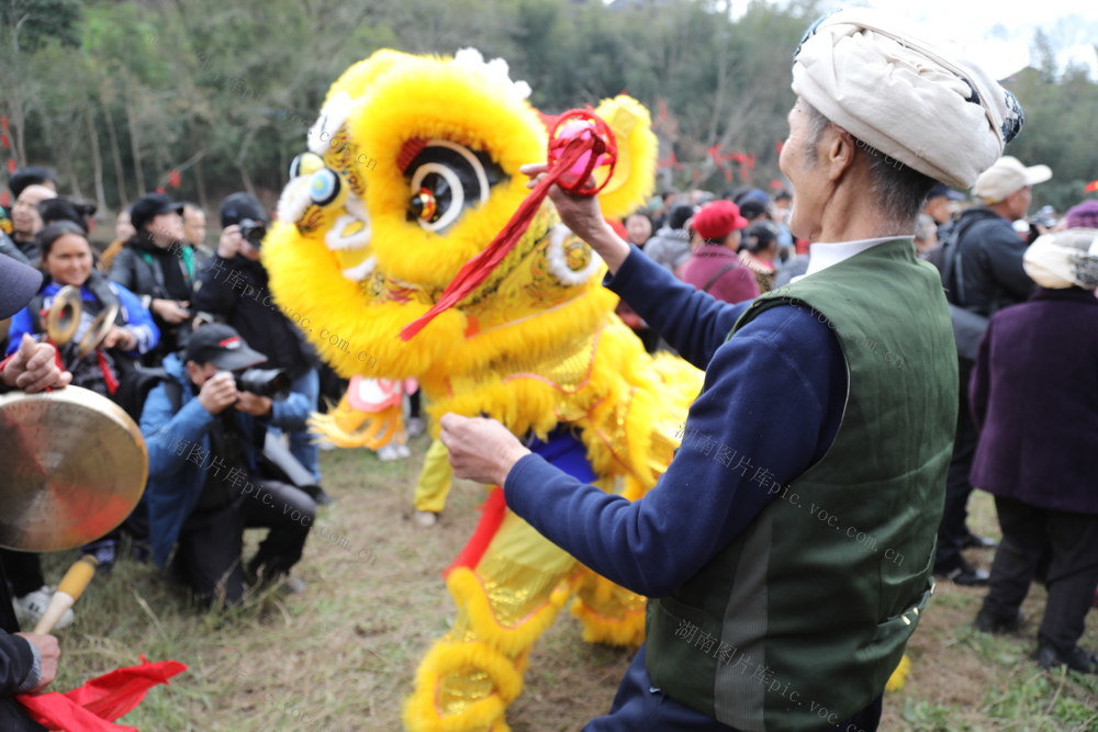 3月3日,湖南省湘西土家族苗族自治州吉首市丹青镇河坪村举办“苗族调年节”活动,村民在活动现场参加舞狮表演,共同祈愿新年风调雨顺。张术杰 摄