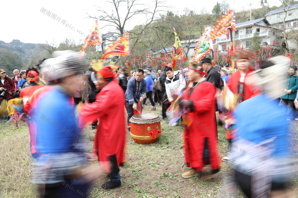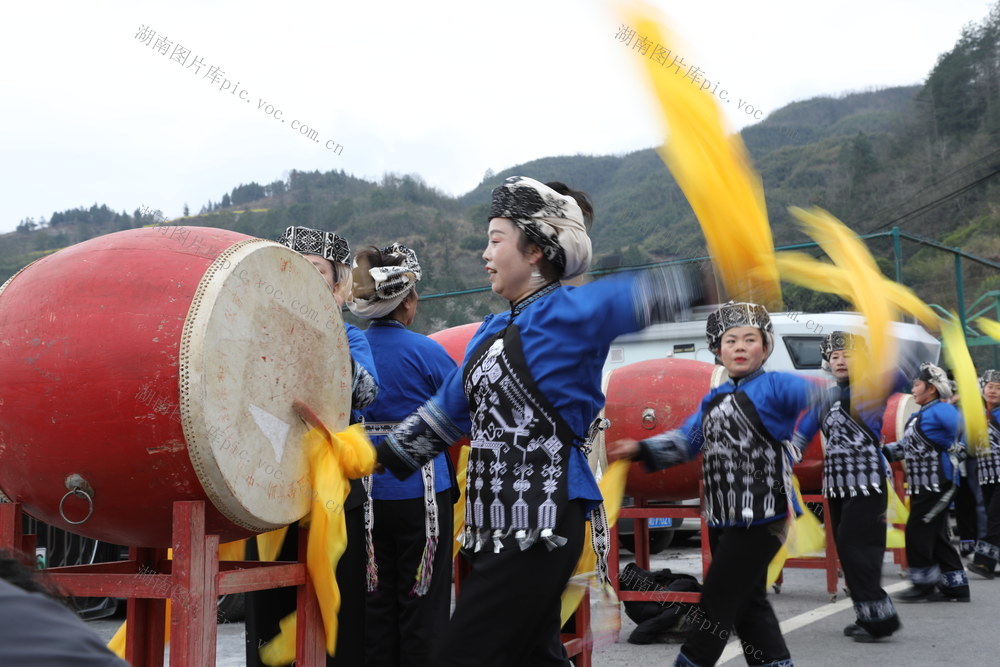 3月3日,湖南省湘西土家族苗族自治州吉首市丹青镇河坪村举办“苗族调年节”活动,村民在活动现场表演鼓舞,共同祈愿新年风调雨顺。张术杰 摄