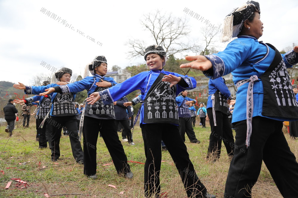 3月3日,湖南省湘西土家族苗族自治州吉首市丹青镇河坪村举办“苗族调年节”活动,村民在活动现场参加舞蹈表演,共同祈愿新年风调雨顺。张术杰 摄
