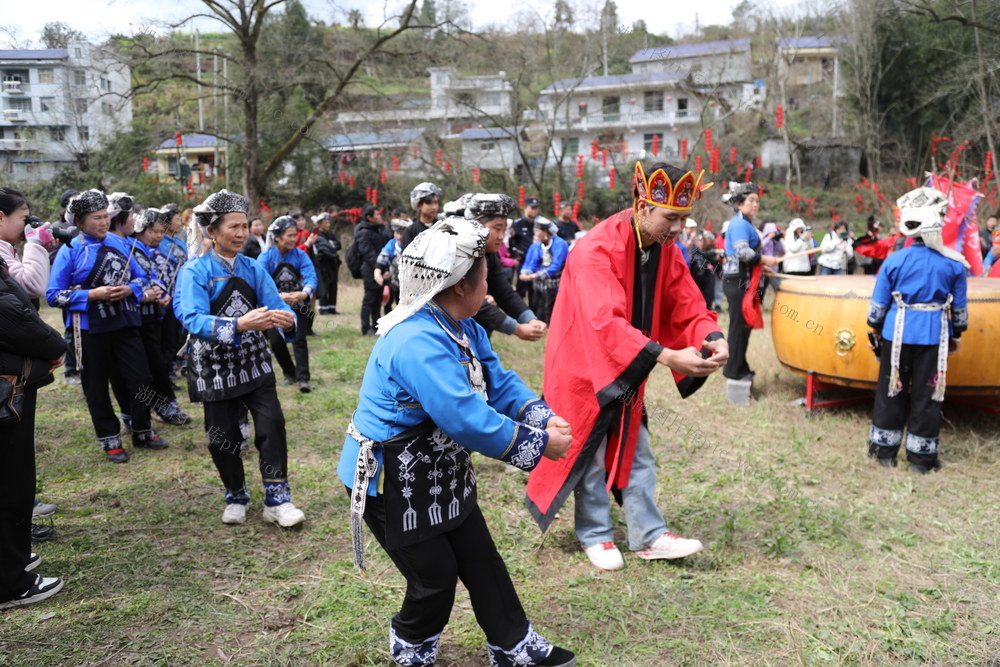 3月3日,湖南省湘西土家族苗族自治州吉首市丹青镇河坪村举办“苗族调年节”活动,村民在活动现场参加表演,共同祈愿新年风调雨顺。张术杰 摄