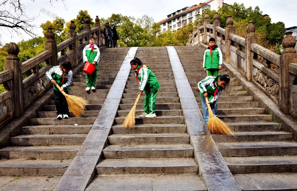 3月5日,吉首市峒河街道向阳社区,光明小学学生在文溪桥清扫、捡拾垃圾。姚方 杨燕萍 摄影报道