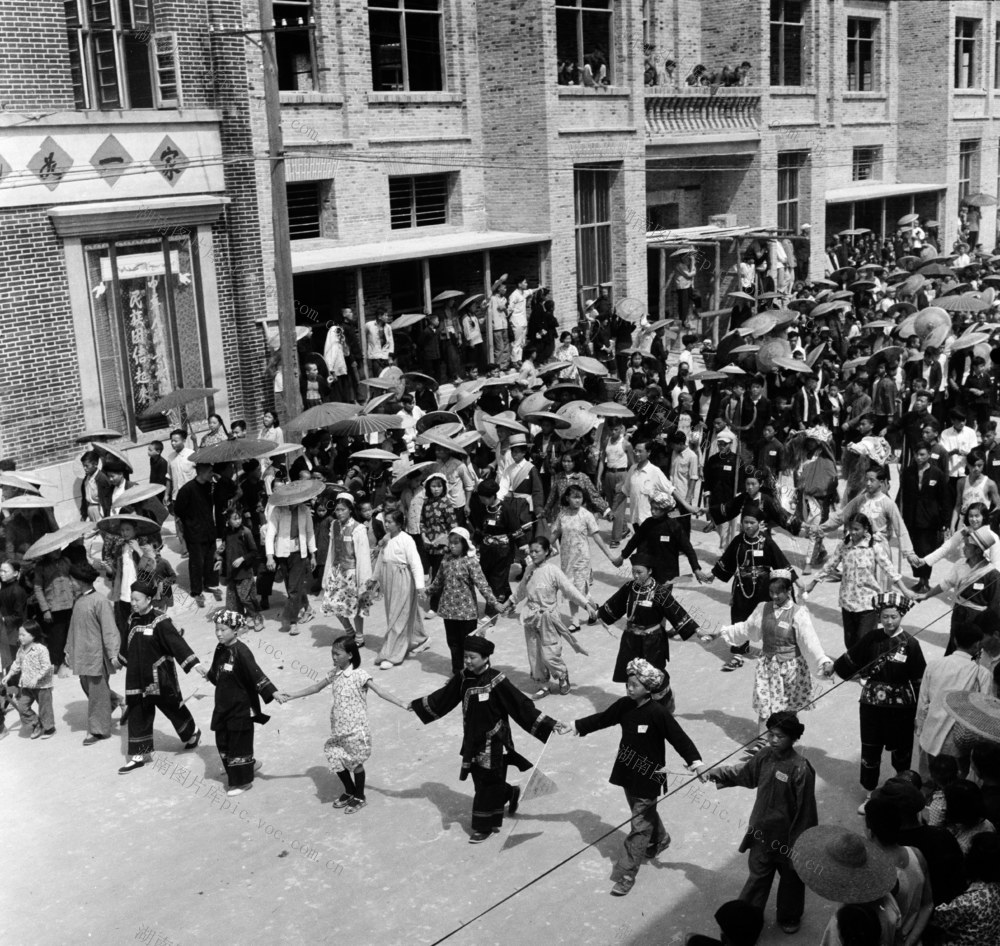 1957年9月20日,100多万各族人民欢欣鼓舞,庆祝湘西土家族苗族自治州成立。图为第一民族师范的学生在会场耍龙舞。 张云龙 摄