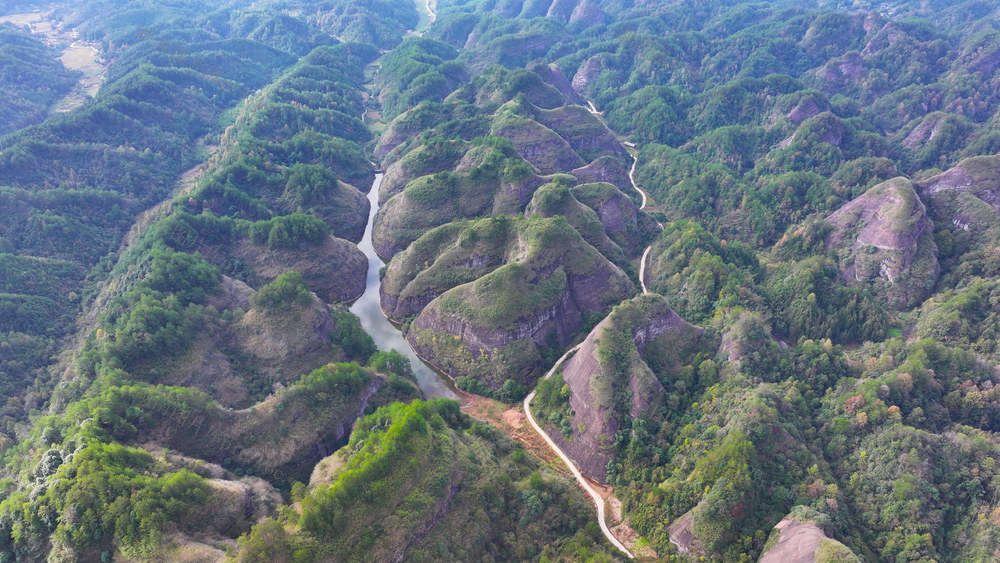 2023年11月20日,俯瞰湖南省通道侗族自治县万佛山国家地质公园,丹霞峰林层层叠叠、树石相间、色彩缤纷,壮美如画,宛如大自然鬼斧神工之作。 李尚引 摄