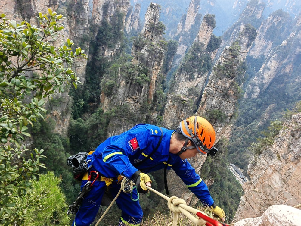 2024年6月12日,张家界武陵源风景区杨家界天然长城景点,景区服务清洁工为保护自然环境,下到悬崖上捡拾垃圾,令人敬佩不已。