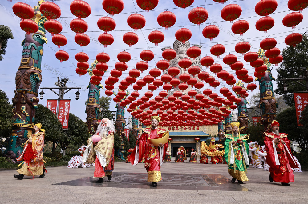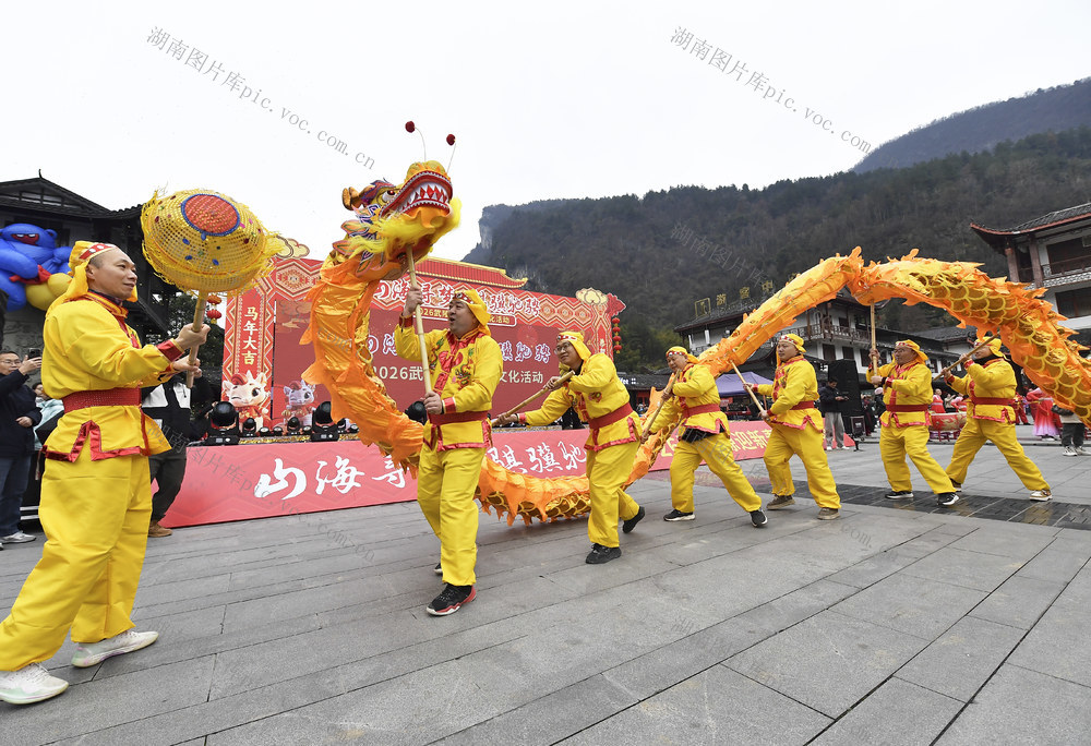 2025年2月12日,在张家界市武陵源区吴家峪门票站广场,当地群众表演民俗节目。 吴勇兵 摄