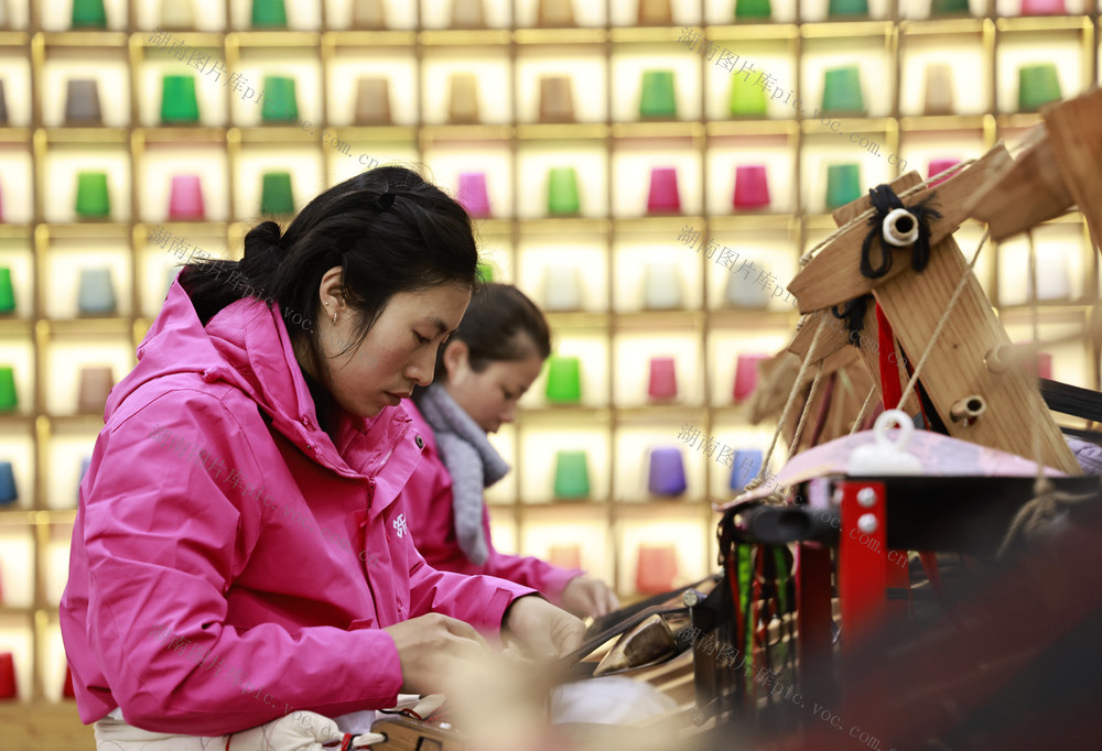 2月24日,在张家界市武陵源区乖幺妹土家族织锦生产研发基地,工人在制作土家族织锦产品。(吴勇兵摄)