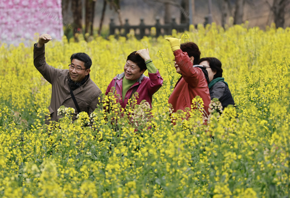 3月5日,人们在张家界市武陵源区黄龙洞景区油菜花田间踏春游玩。(吴勇兵摄)