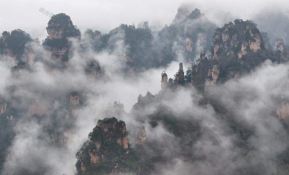 2026年3月8日,雨后的湖南张家界国家森林公园十里画廊、百龙天梯,飘逸的云雾在峰林间蜿蜒迂回,宛若水墨画卷。吴勇兵 摄