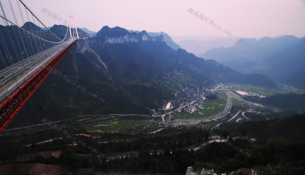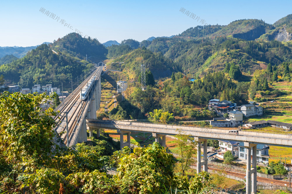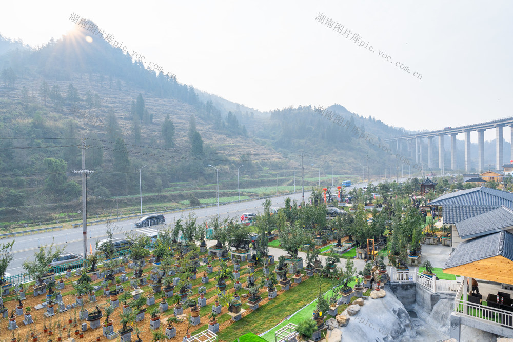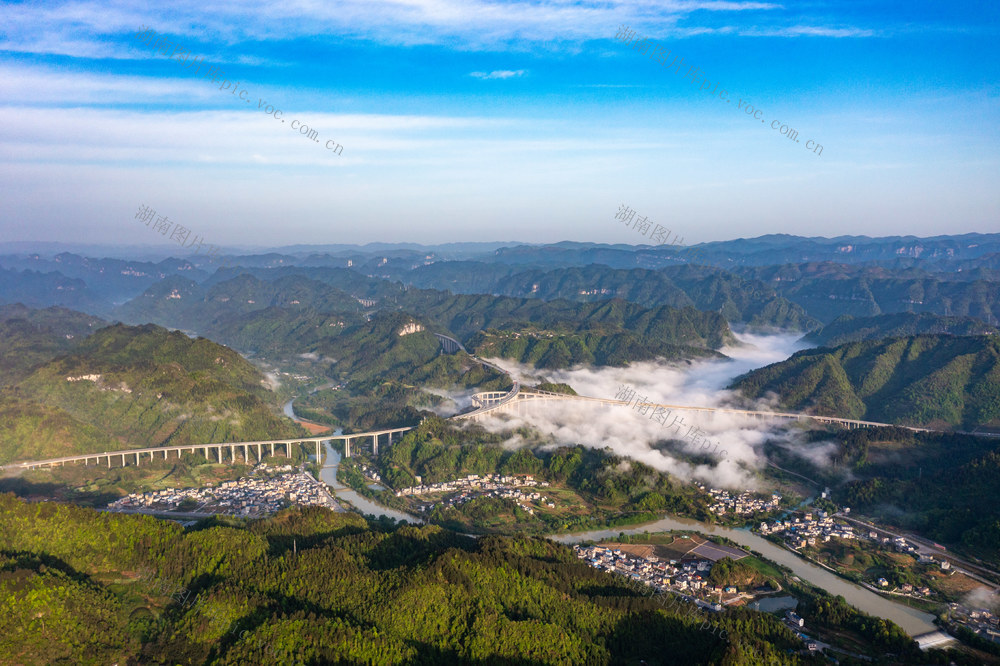 2023年11月28日,湖南省湘西土家族苗族自治州吉首市石家冲街道庄稼村,云雾、高速公路、田园村庄相互辉映,美如画卷。