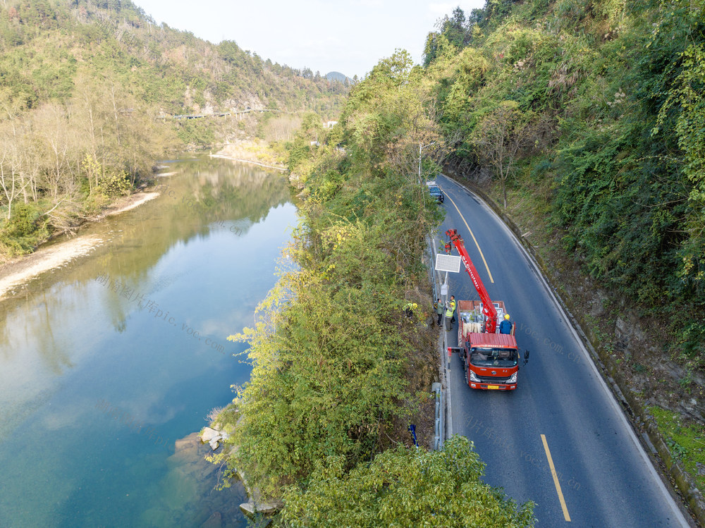 2025年12月13日,吉首市矮寨镇坪朗村,工人在G209国道安装太阳能路灯。彭璟 摄
