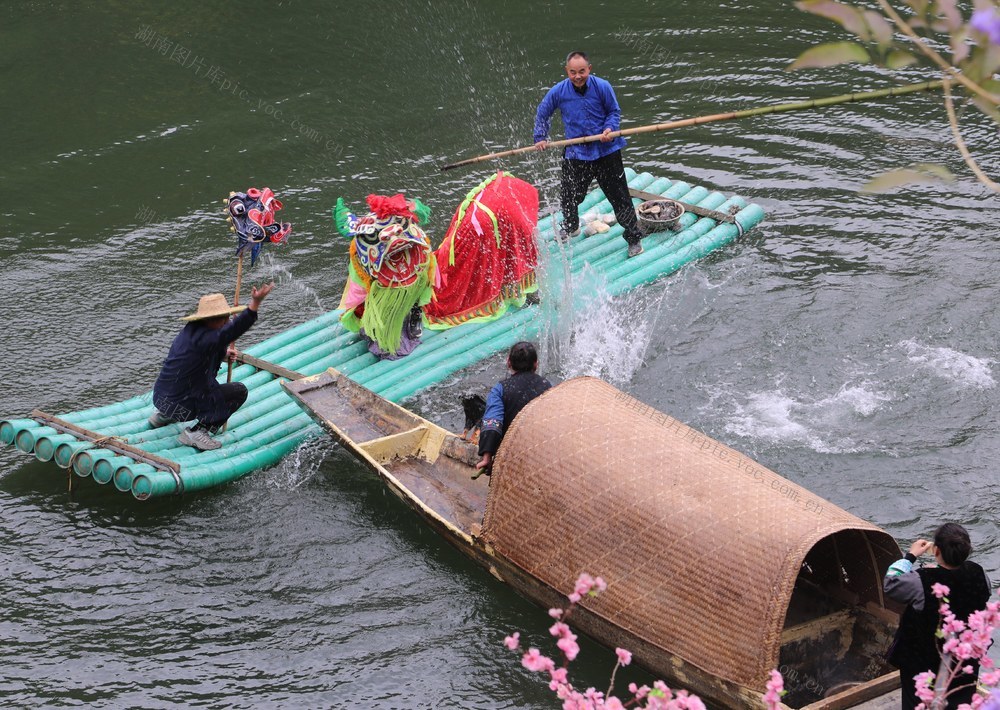 在吉首市太平镇,村民与游客共同体验竹排舞狮,感受民俗魅力。刘丹 陈生爱 摄