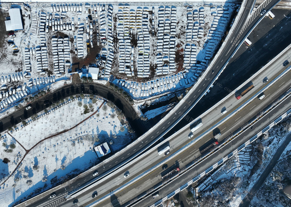 2024年1月23日,在湖南省衡阳市蒸湘区一车行停车场,白雪覆盖下汽车与立交桥行驶的车流相映生辉(无人机照片)。