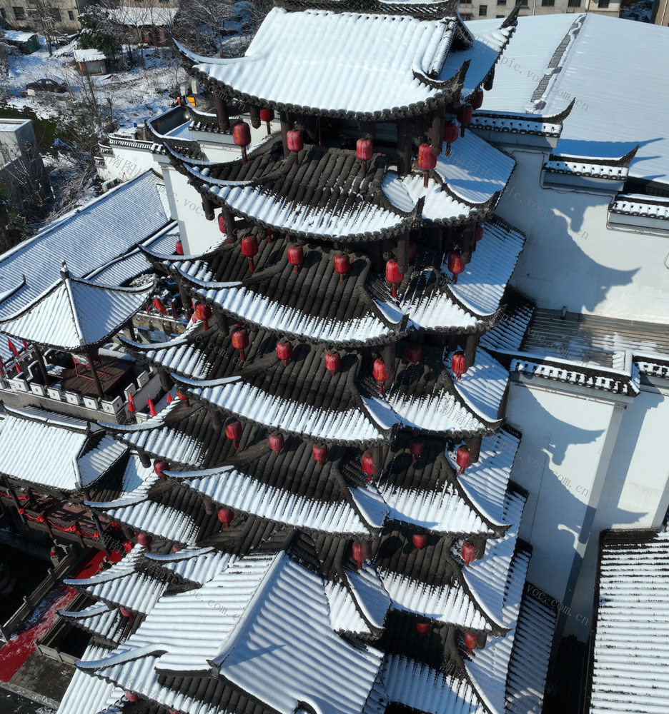 2024年1月23日,在湖南省衡阳市蒸湘区拍摄的衡州府阁楼在白雪的映照下别有韵味。(曹正平摄)。