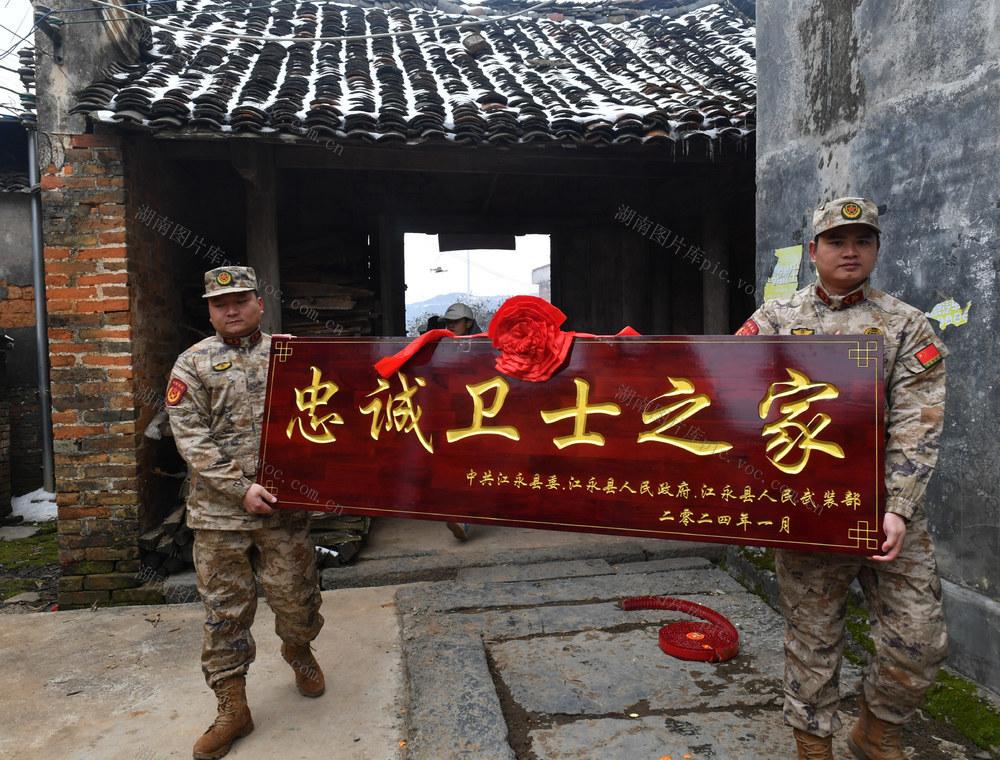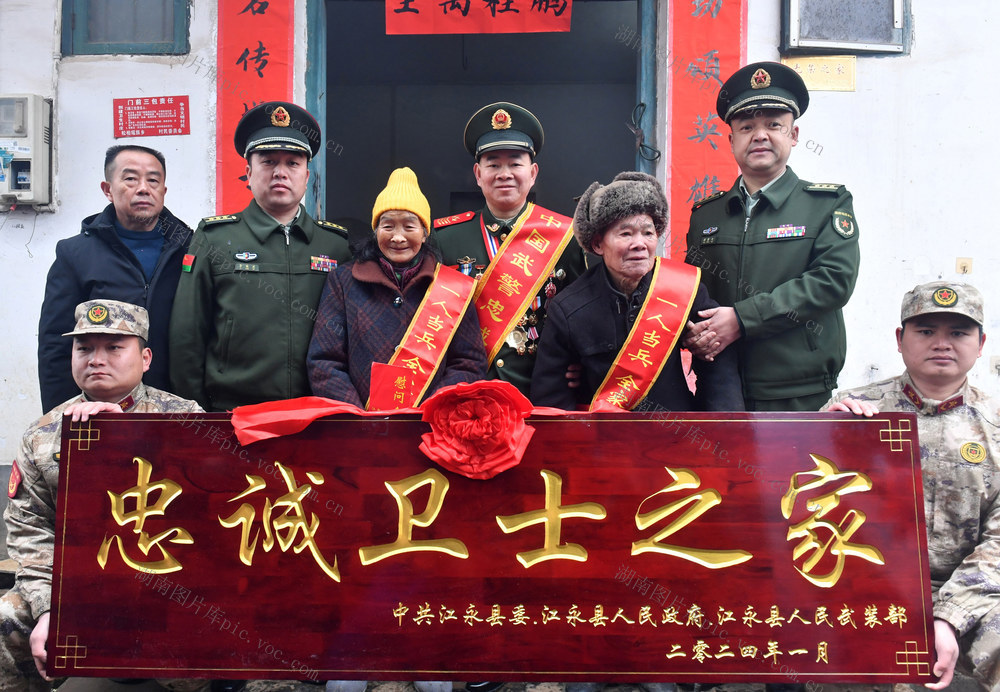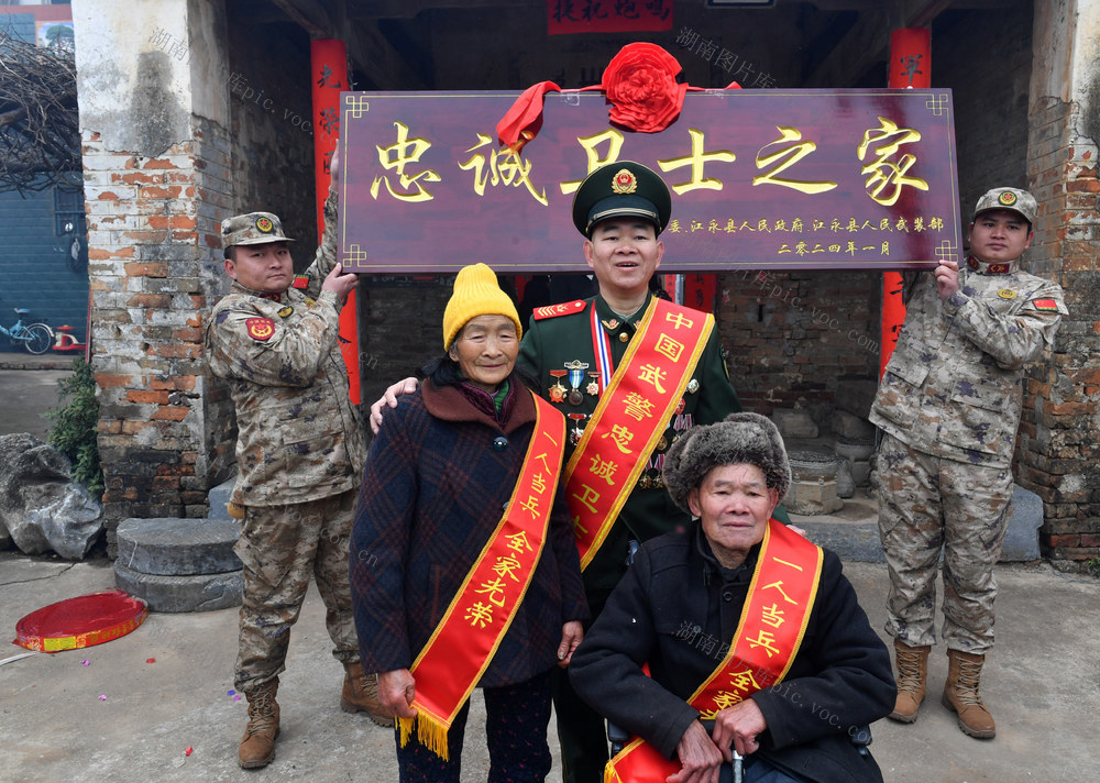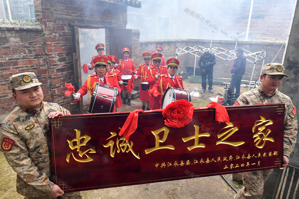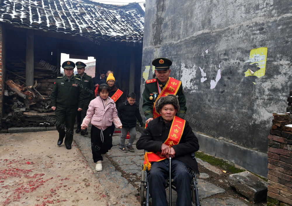 1月25日,新当选的第24届“中国武警忠诚卫士”蒋云忐在湖南省永州市江永县人武部、退役军人事务局等相关部门负责人的陪同下,载誉回到江永县松柏瑶族乡水美村的瑶寨家中,年近八旬的父母及乡亲们敲锣打鼓到村口迎接。黄海 摄