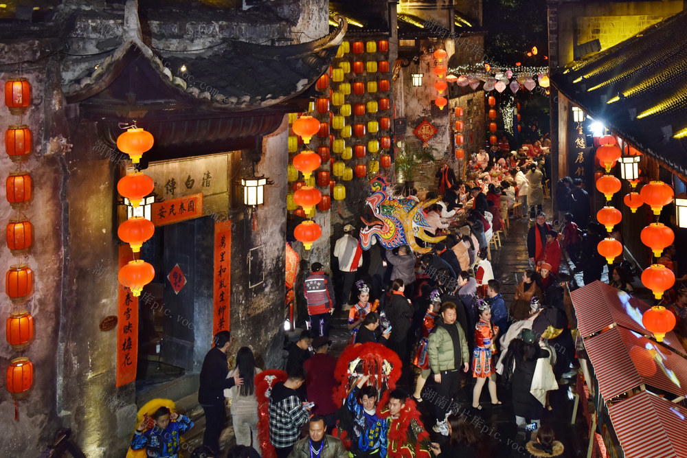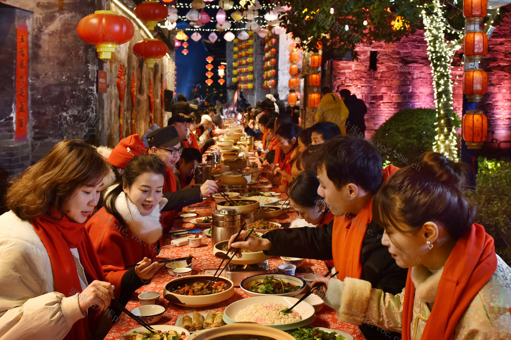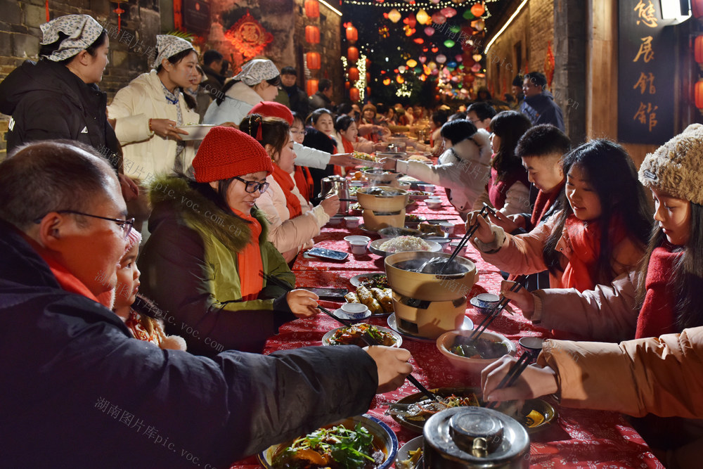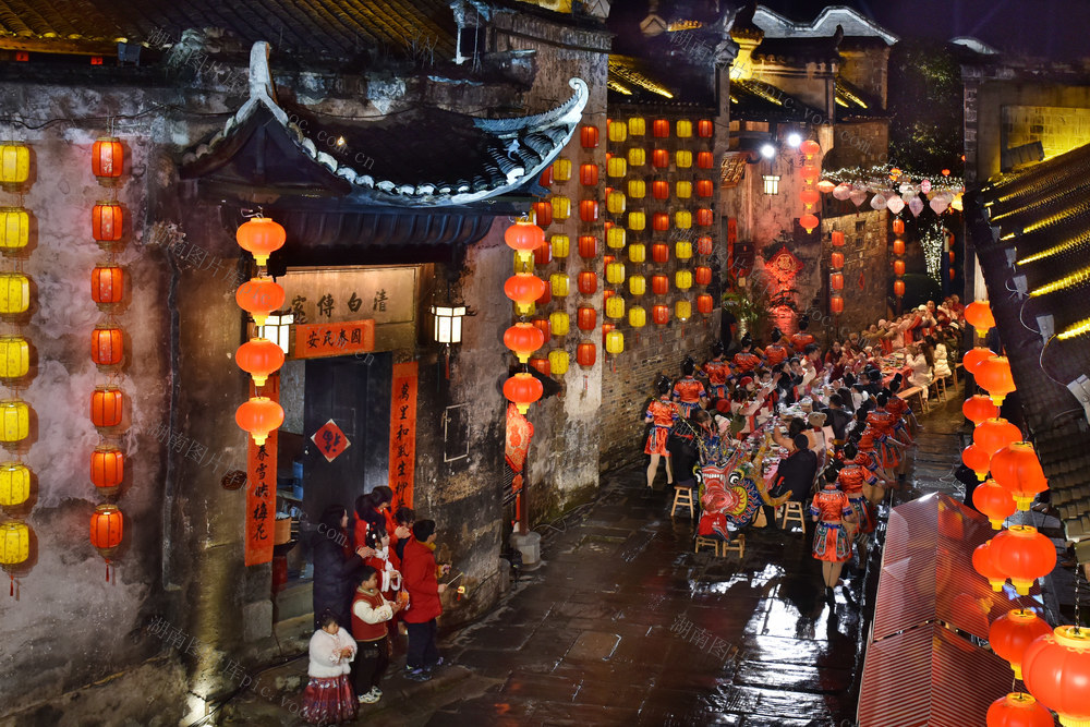 2月9日,大年三十晚,洪江市黔阳古城内喜庆祥和、热闹非凡,一张张桌子摆满大街小巷,千余名当地居民和游客共尝“长龙”团年宴,喜迎龙年的到来。当晚的黔阳古城,装点一新,红灯笼、中国结、璀璨夺目的五彩霓虹流光溢彩,处处洋溢着新春的年味。杨锡建 李林 摄