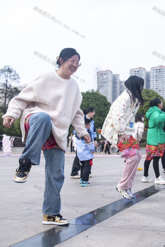 2024年3月7日,在娄底市娄星区孙水公园,长郡怡和幼儿园迎“三八”国际妇女节亲子活动现场,妈妈们表演穿花裤。吴永华 摄
