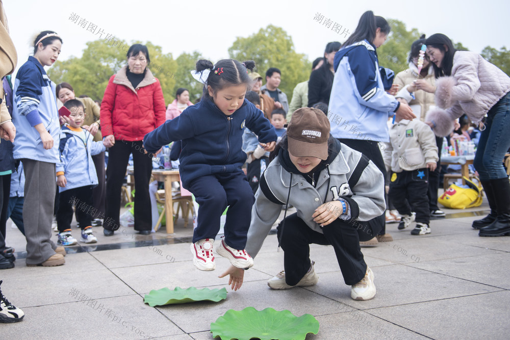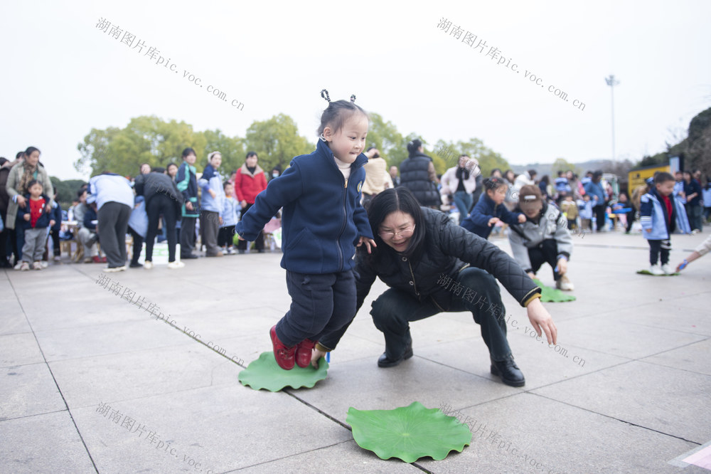 2024年3月7日,在湖南省娄底市娄星区孙水公园,长郡怡和幼儿园迎“三八”国际妇女节亲子活动现场,妈妈带着孩子玩小青蛙跳荷叶。吴永华 摄