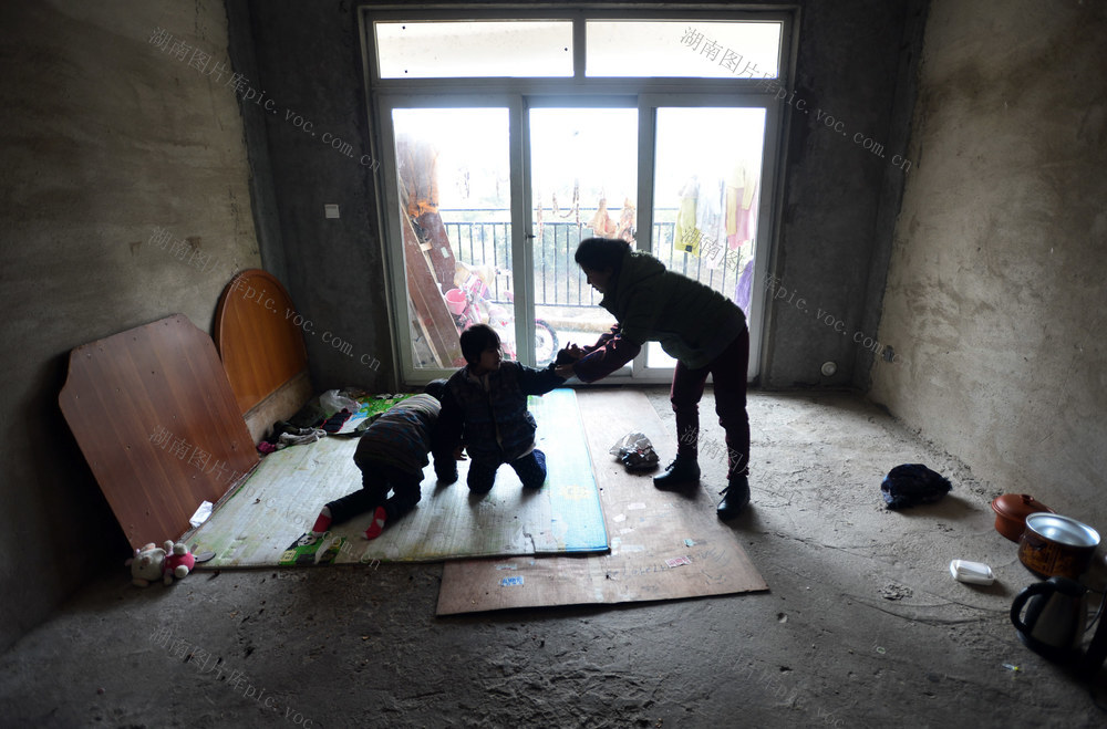 2015年2月6日,朱冬文抱着小女儿朱思颖准备换个房间继续做康复练习。小女儿虽然情况差一点,但是经过不断的康复练习,也有一定的好转。 李健 摄