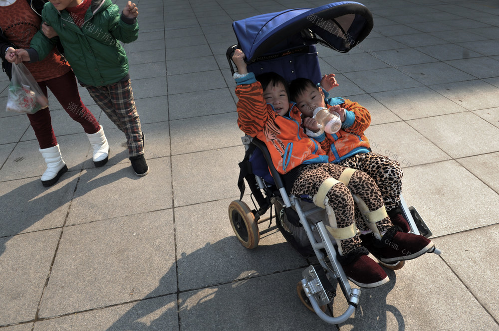 2013年12月4日,湘雅博爱康复医院前坪,朱思慧(左)和朱思颖坐在轮椅里,等父亲朱冬文推她们回租房。虽然姐姐朱丽蓉的病情要好一些,在带着脚模矫正器的情况下还可以勉强走几步。 李健 摄