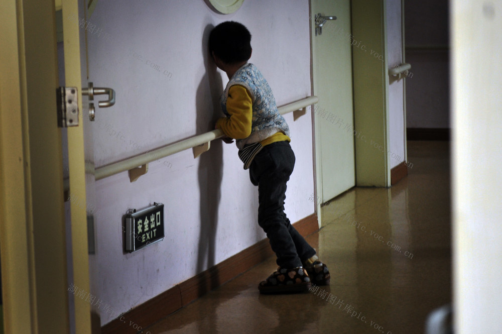 一名小孩独自一人,扶着墙上的护拦慢慢前行、练习。在康复中心主任杨杰的心中,这些孩子都是天使,都该被挽救。惋惜的是,几年来,他也见过了太多的孩子失去了康复的机会。 李健 摄