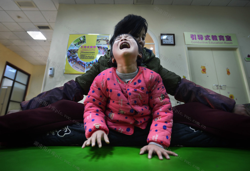 2015年2月6日,湘雅博爱康复医院,王群在为小女儿向丽萍做压腿练习。2014年9月中旬,她好不容易从龙山县残联要到了免费康复的名额,用湘西特有的包袱背着6岁多的双胞胎大女儿向丽佳,抱着小女儿向丽萍,让陪同的残联工作人员拎着包袱,母女三人一路吐着过来,午夜12点才赶到长沙。 李健 摄