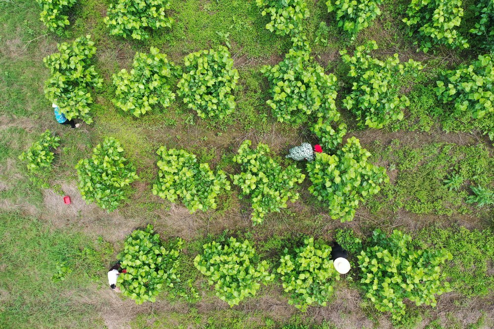 4月24日,衡阳市衡山县开云镇山竹村乐田休闲农场里,在这务工的村民正在采摘成熟的桑葚。