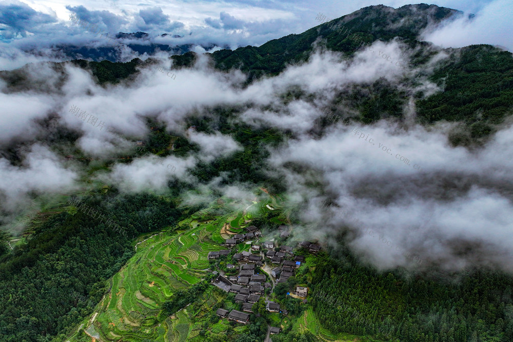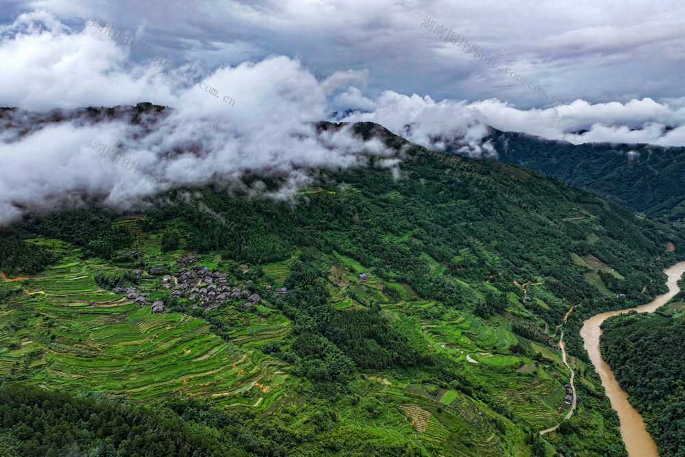 2024年7月2日,湖南省怀化市通道侗族自治县陇城镇老寨村,村庄坐落于半山腰,在晨雾中若隐若现,与周边的青山、田园、河流相互映衬,构成一幅美丽的生态画卷。石猛雷 摄