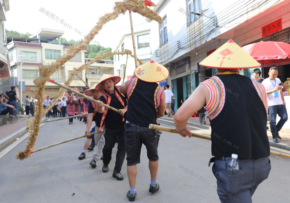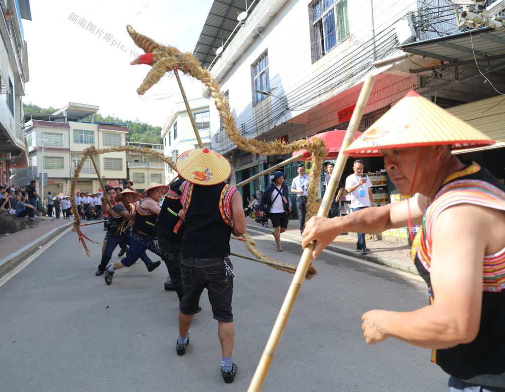 2024年7月11日,湖南省永州市道县洪塘营瑶族乡,人们在舞动草编龙。何红福 摄