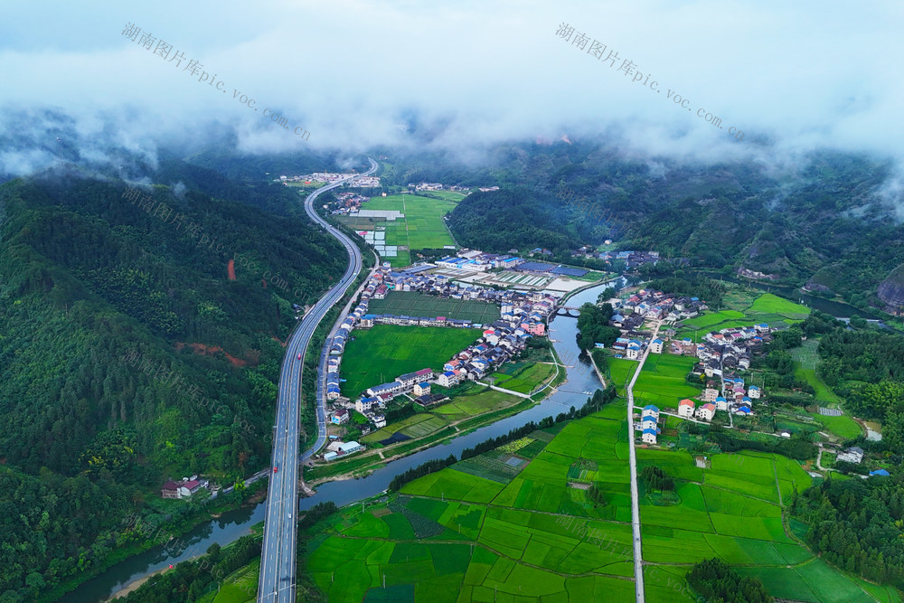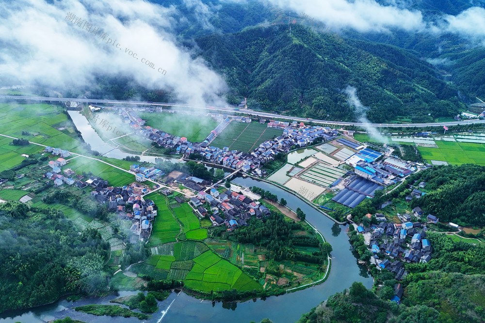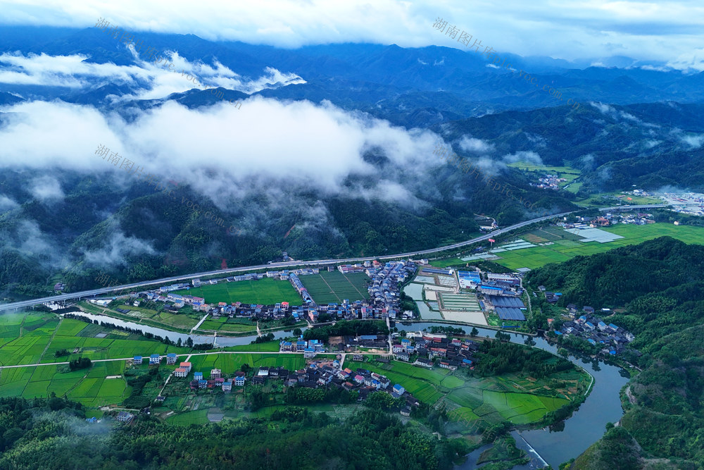 2024年8月1日,俯瞰湖南省通道侗族自治县万佛山镇下乡村,飘逸的云雾、繁忙的公路、迂回的河流把多彩的乡村打扮得灵动迷人。