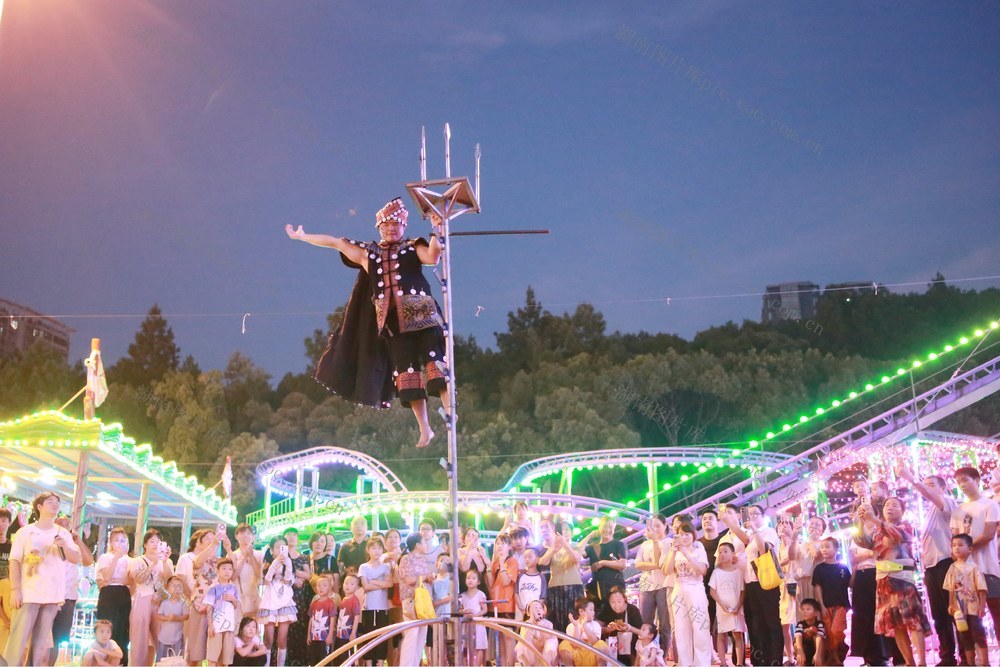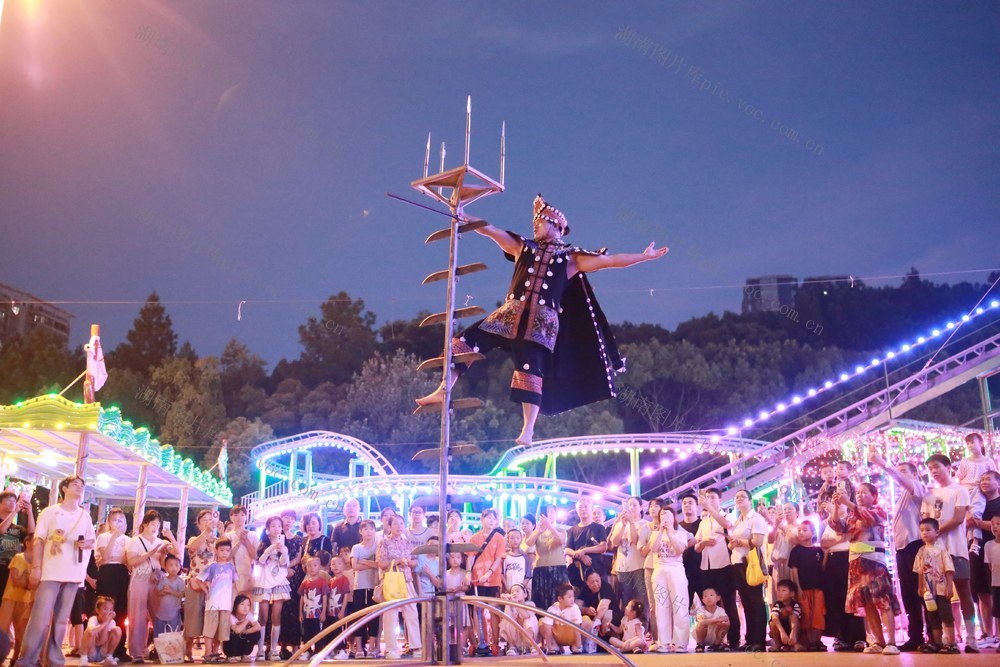 2024年8月19日,湖南省永州市冷水滩区潇湘公园,民间艺人在表演非遗“上刀山”。彭华 摄