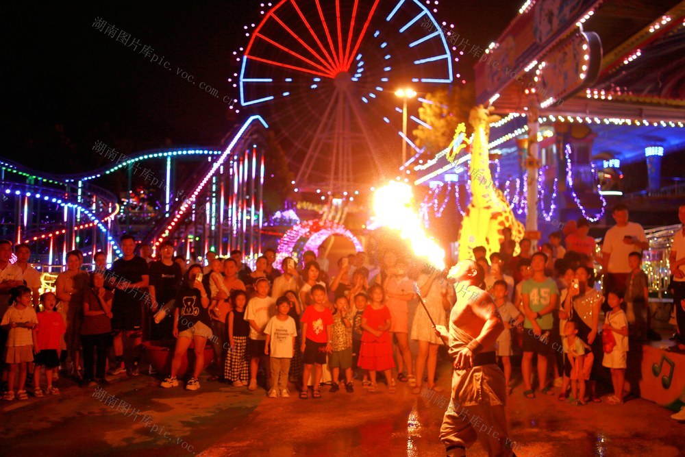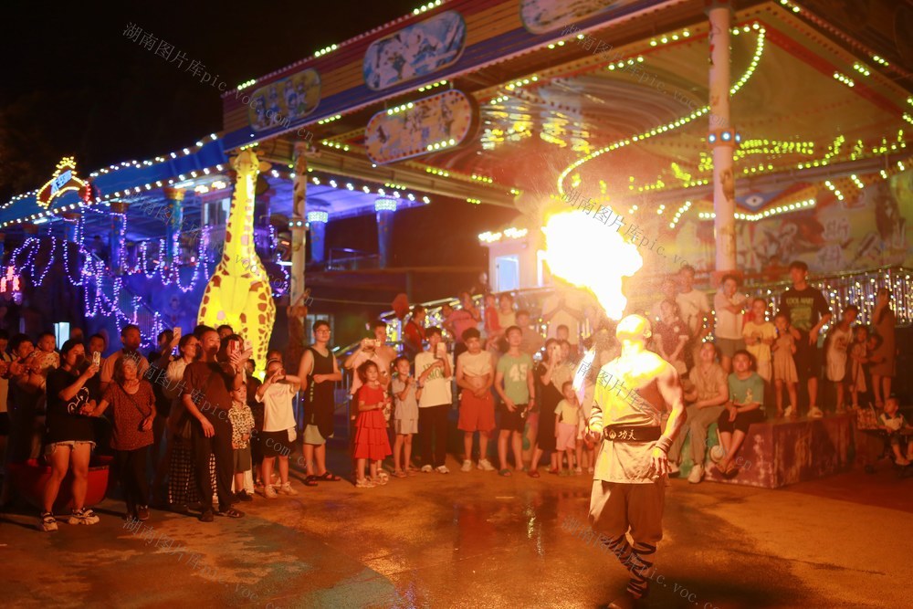 2024年8月19日,湖南省永州市冷水滩区潇湘公园,民间艺人在表演非遗“喷火”。彭华 摄