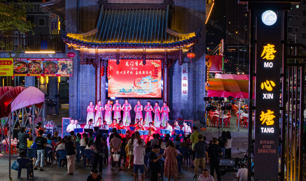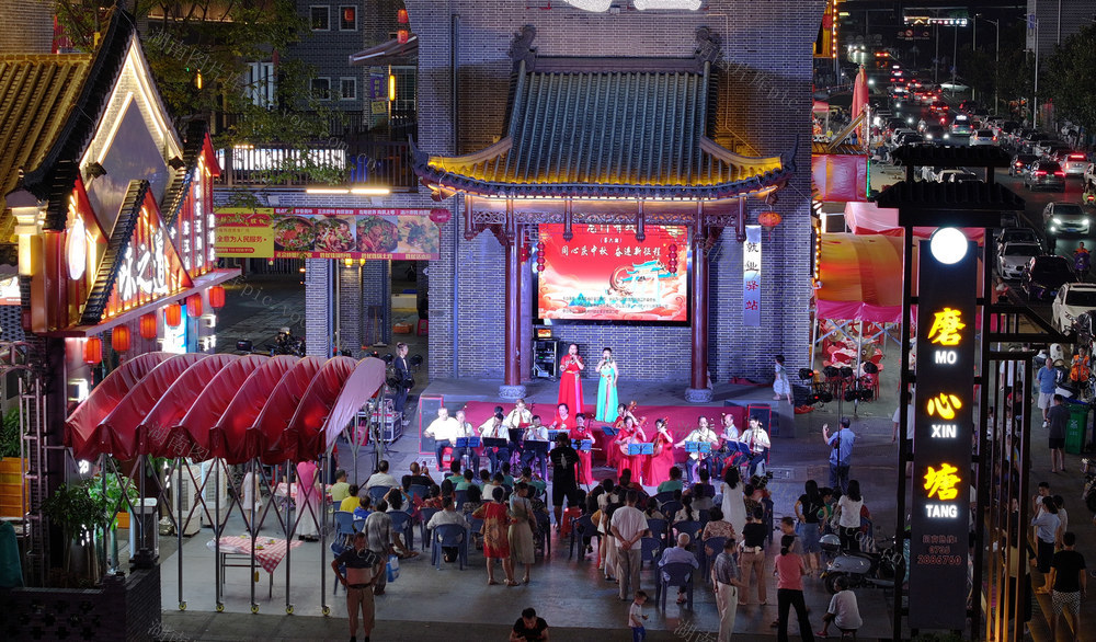 v8月29日晚,郴州市苏仙区白鹿洞街道石榴湾社区在磨心塘美食街“龙门有戏”舞台举办了一场以“同心庆中秋,奋进新征程”为主题的中秋文艺汇演。“龙门有戏”系列群众文艺活动今年初启动,原则上一月一场文艺演出贯穿全年。这个属于社区居民的百姓舞台,由白鹿洞街道八个社区轮流“领衔主演”。本场由石榴湾社区“领衔”的专场文艺汇演是今年“龙门有戏”的第六场,通过社区发动、居民参与,群众自编自演的传统文艺节目,既让观众了解中国文化,增强了民族自信,也让市民提前感受到了浓浓的中秋佳节传统文化氛围。黄建华 摄
