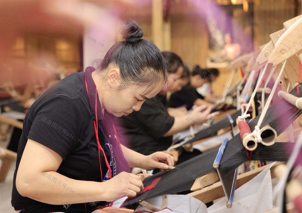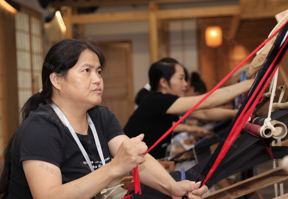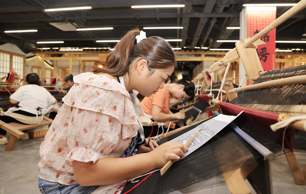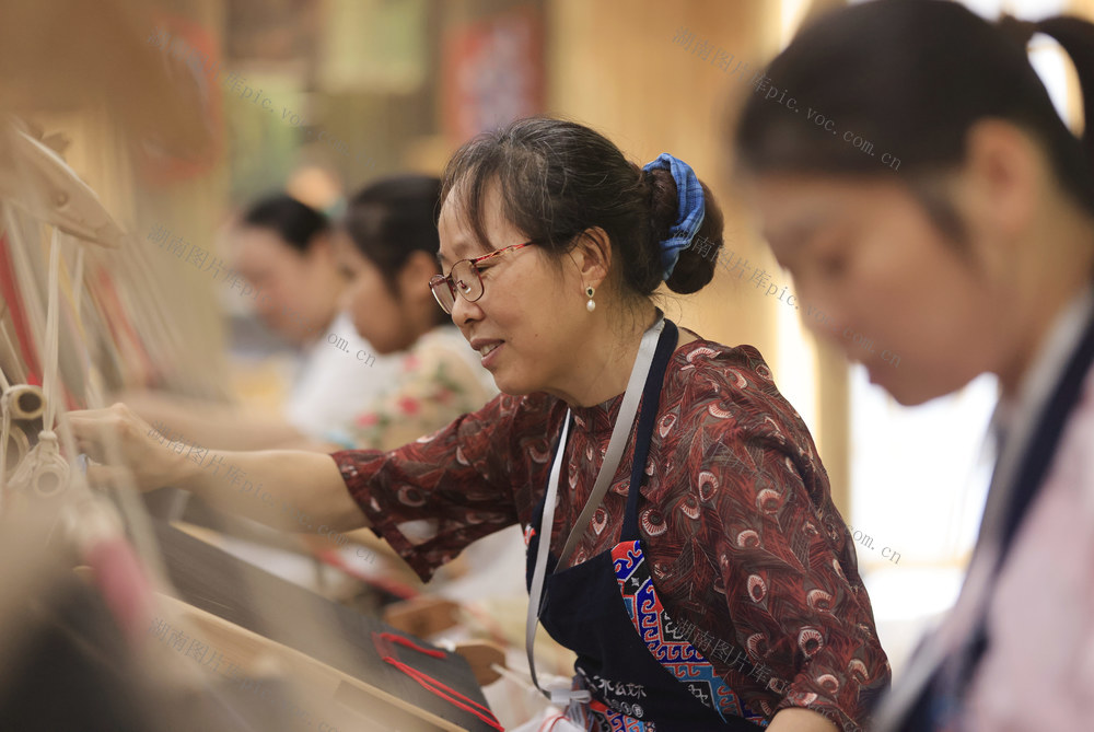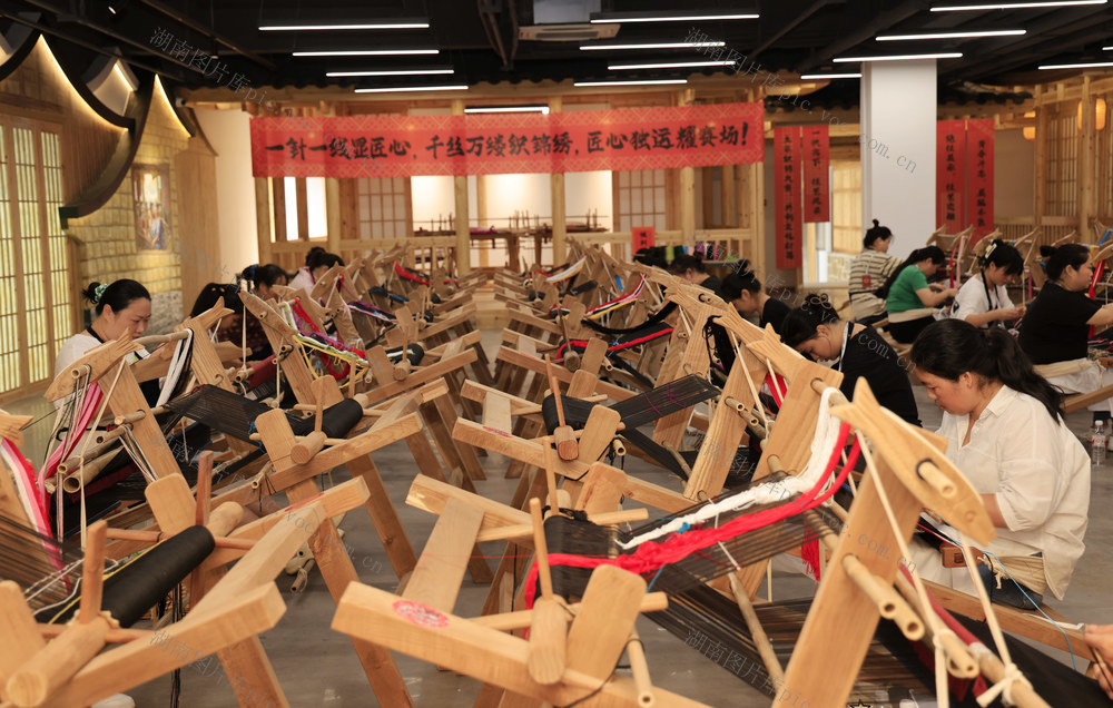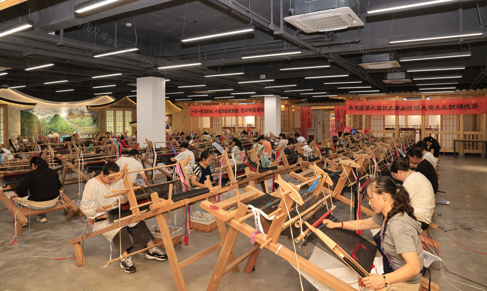 2024年9月20日,在张家界市“乖幺妹”土家织锦文化创意园,织锦女工进行土家族织锦技能大赛。吴勇兵 摄