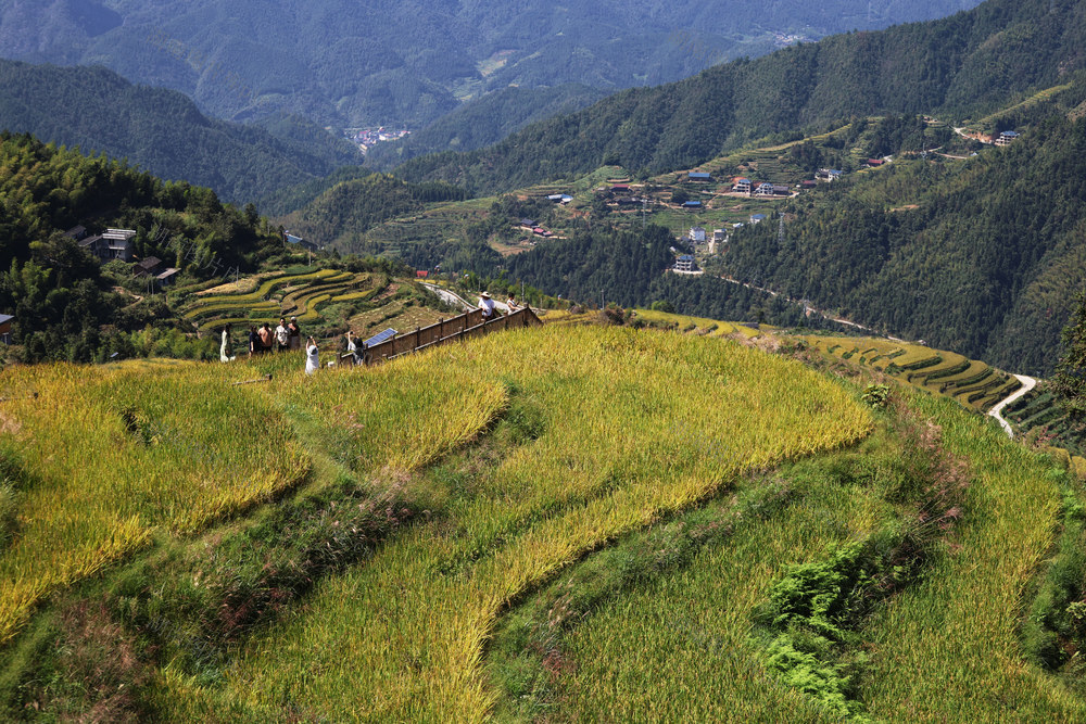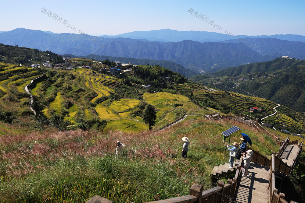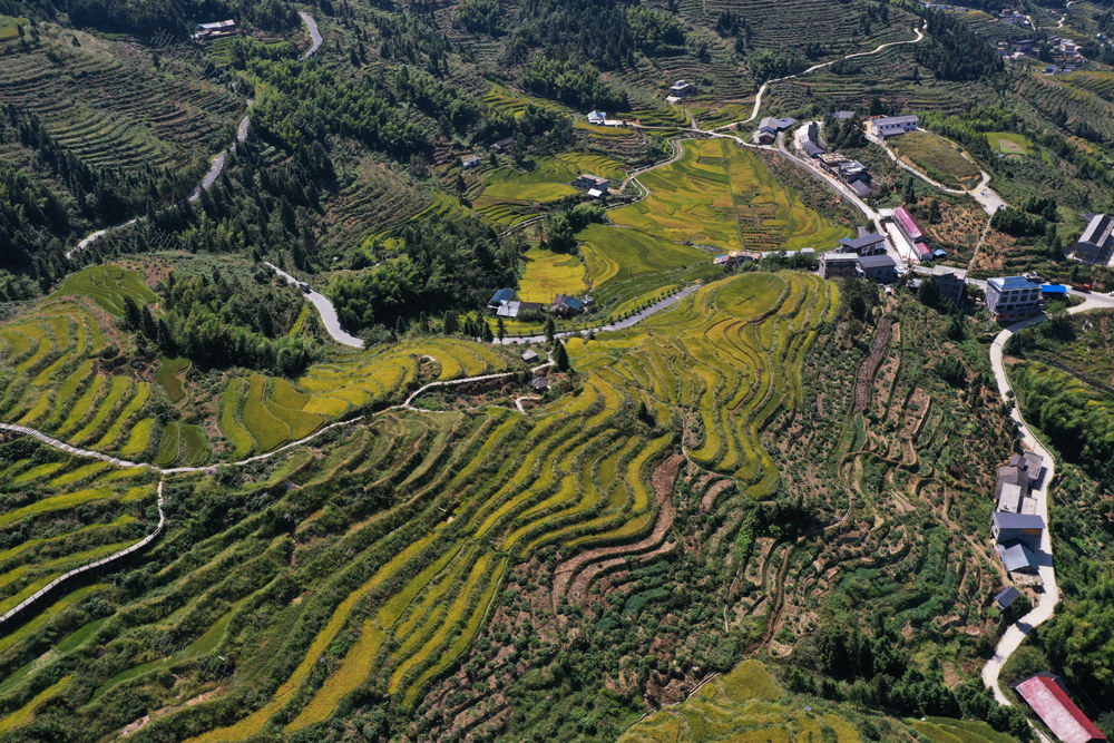 9月22日,湖南省溆浦县山背梯田,稻田、民房、公路相映成趣,形成一道美丽的田园画面。柴均林 摄
