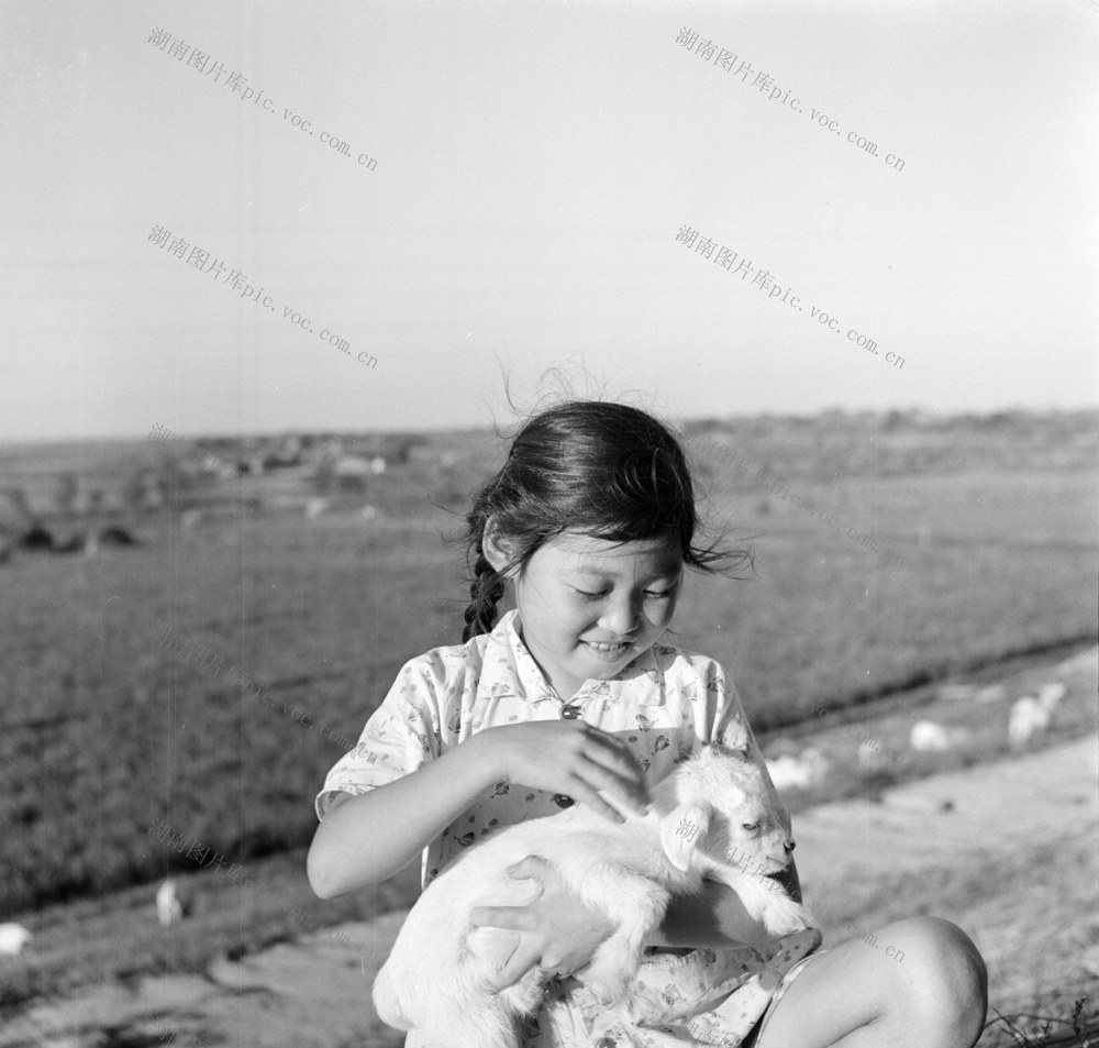 1963年9月,(湖南)省劳动模范——何桃秀同志是(常德市)汉寿县洲口公社小港大队第六生产队的社员,他热爱集体,为六个生产队养羊64头,小猪44头,鹅34只,由于他精心的看养,小羊繁殖很快,这是何桃秀同志抱着小羊多高兴。唐又庭 摄