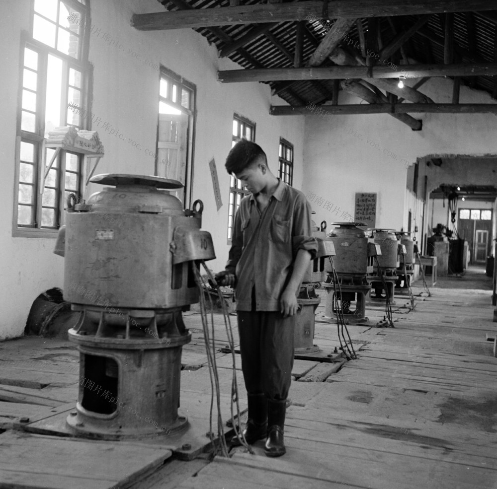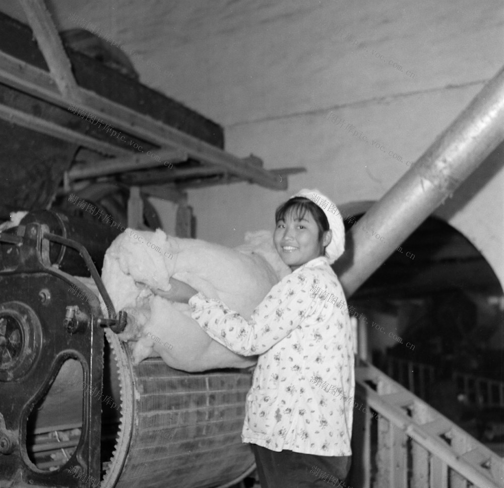 1963年8月,(常德市)汉寿县供销社采购经理部破头轧花厂,毛刷式141片型棉籽脱绒机,积极的投入棉籽脱绒,每台八小时可产短绒216斤。这是工人正在棉籽脱绒的情形。唐又庭 摄