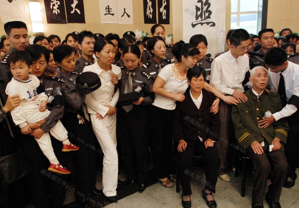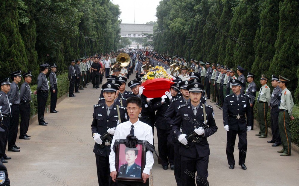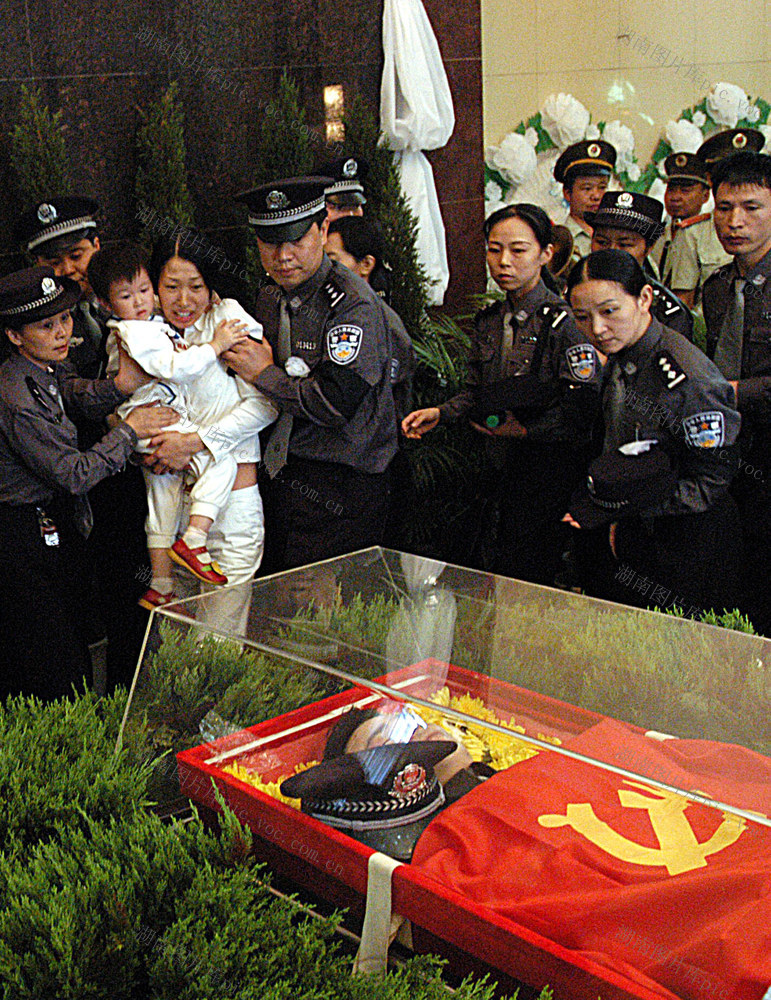 2003年9月8日上午,省会各界代表在湖南省革命烈士陵园为勇斗歹徒壮烈牺牲的长沙市公安局巡警支队芙蓉大队民警张杰明送行。刘建光 摄