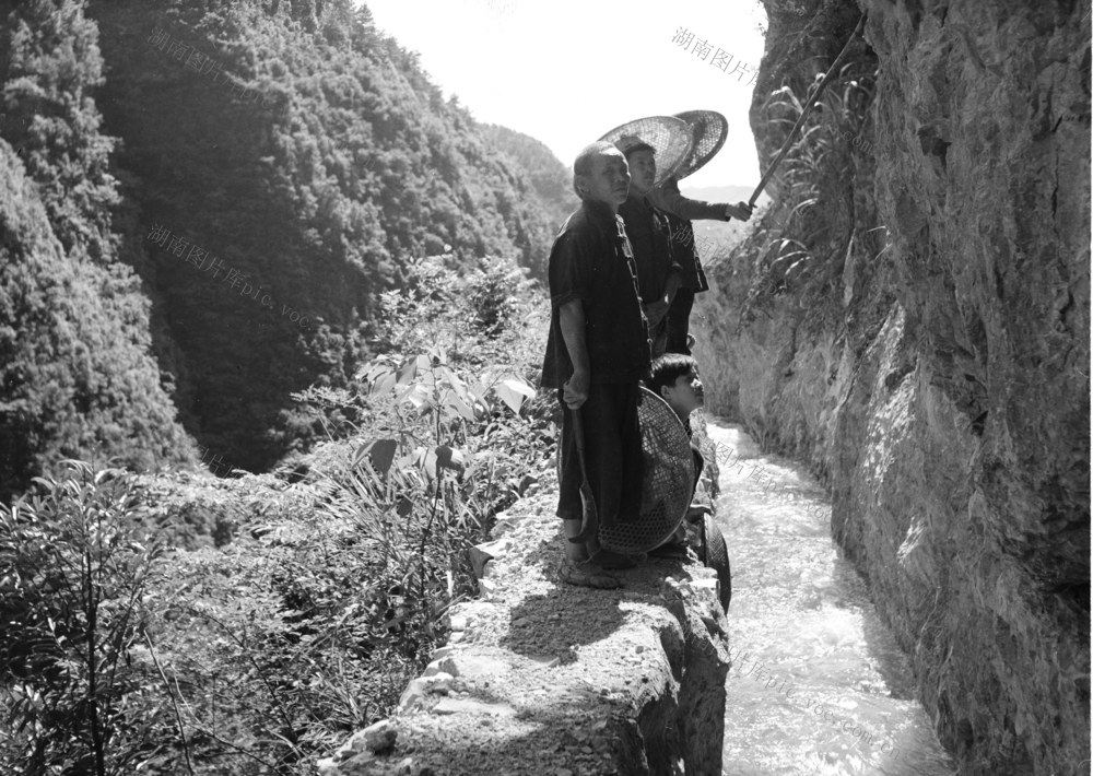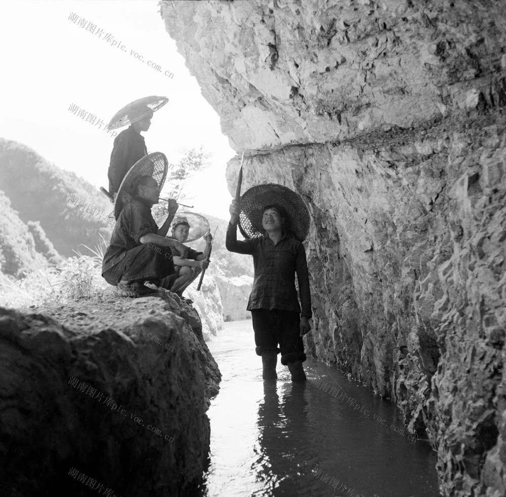 1965年6月24日,花垣县雅桥公社的社员们在社会主义教育的鼓舞下,革命精神大振,奋战4个多月,终于在悬崖上开凿了1条长2100米,宽1.6米,高1米的环山渠道,水顺着人们意志到高山,灌溉良田。黎善绍 摄