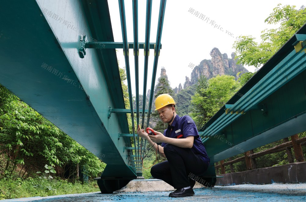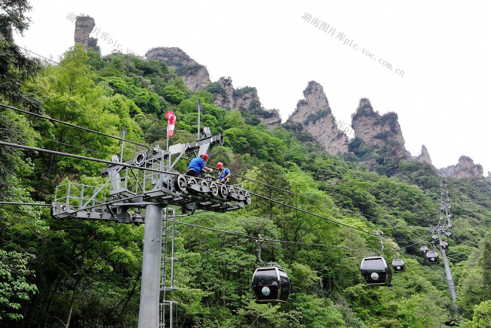 5月1日,湖南张家界市武陵源区天子山索道工作人员在巡检设备。 吴勇兵 摄