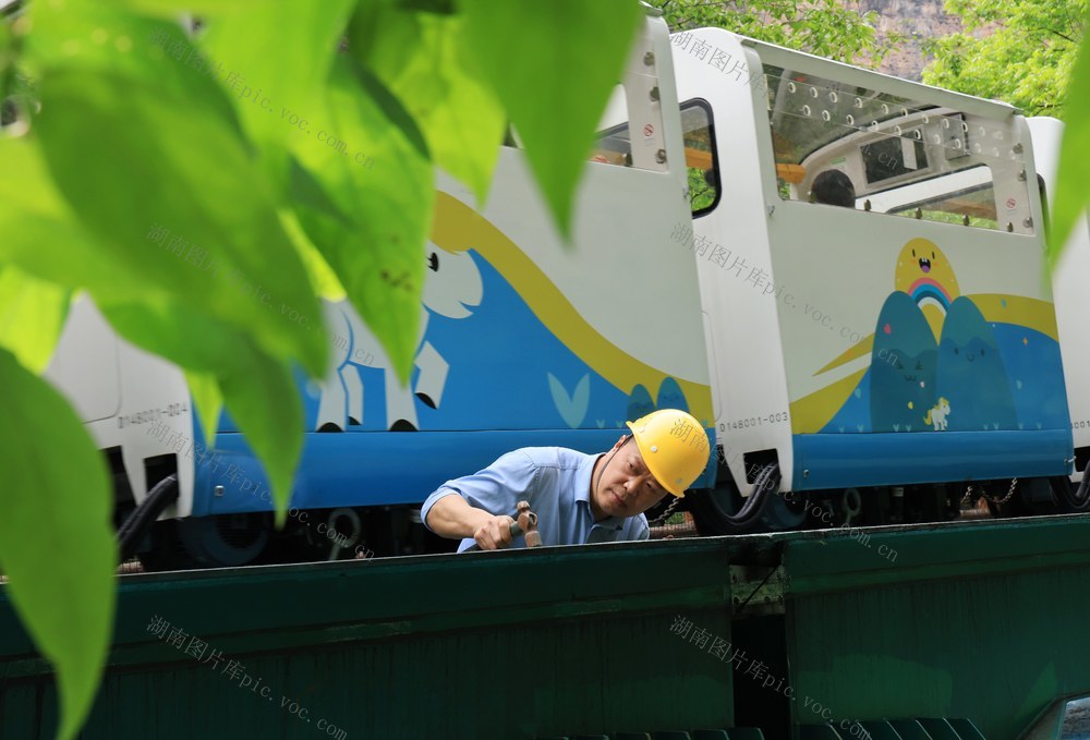 5月1日,湖南张家界市武陵源区十里画廊观光电车工作人员对轨道进行安全检查。 吴勇兵 摄