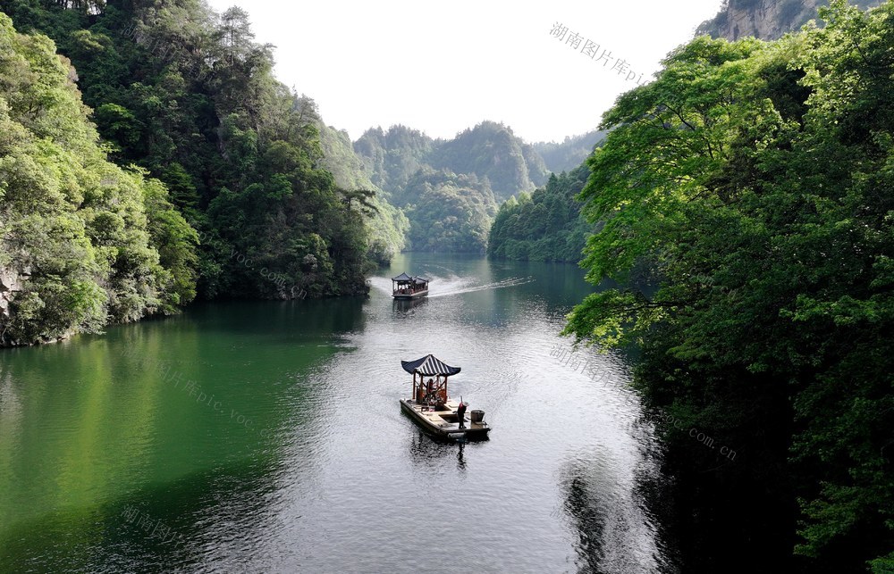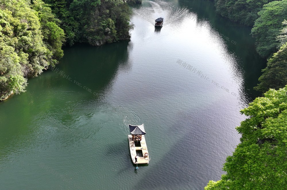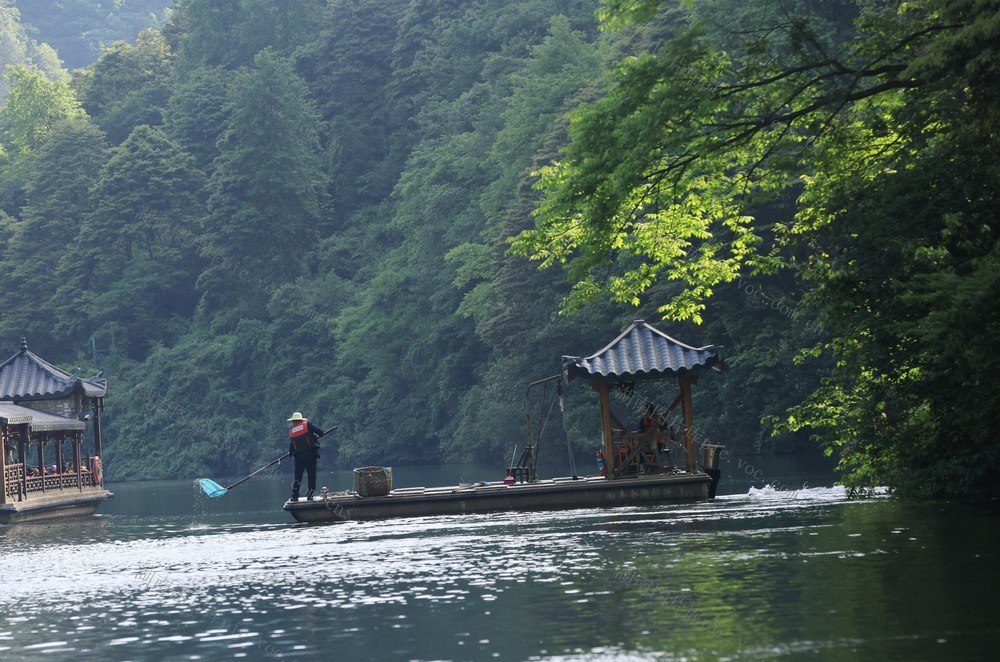 5月1日,湖南张家界市武陵源区宝峰湖景区工作人员在清理湖面上的树叶、枯枝等飘浮物。 吴勇兵 摄