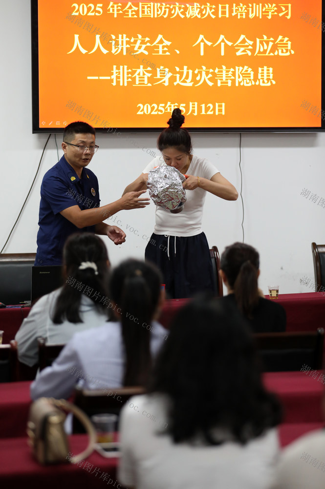 5月12日,在资兴市文化馆,消防员向职工普及防灾减灾知识。(李科 摄)